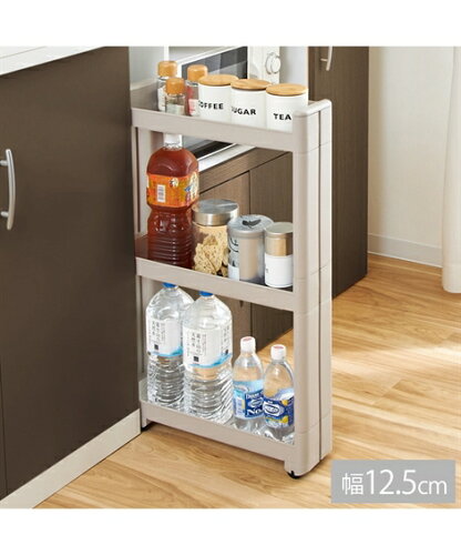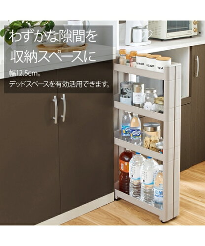 他のサイズは以下をご覧ください 幅12.5×奥行45cm(3段) はこちら【日本製】隙間ワゴン(グレー)【幅12.5cm】 ニッセン nissen グレー カラー グレー サイズ 2・幅12.5×奥行45cm(4段) 素材 ●材質:ポリプロピレン●キャスター付き(ストッパー無し)●耐荷重(約):上段=4kg、下から2段目=6kg、下段=10kg、他棚板=4kg 原産国 ●日本製 メーカー品番 ZZY4320B3664 コメント わずかなすき間もムダなく活用できる収納ワゴン。
