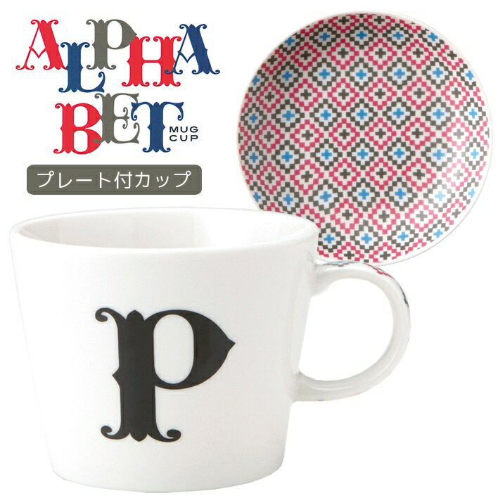 アルファベット プレート付 マグカップ イニシャル マグカップ &小皿 ギフトセット P 東欧風ALPHABET MUG お洒落デザイン食器 陶器製 テーブルウェア MADE IN JAPAN/日本製誕生日ギフト 取寄品 【プレゼント】【誕生日ギフト】【結婚祝い】【のし利用可】